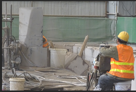 對(duì)于混凝土墻的切割和鑿邊,使用線(xiàn)鋸系統(tǒng)(墻鋸系統(tǒng))首先切割孔的三個(gè)側(cè)面,然后切割第四個(gè)側(cè)面只切斷鋼筋。然后用鎬鑿開(kāi)。
