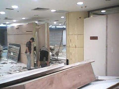 要求當天拆裝 物品基本當天晚上運出,盡量不要將物品留在現場,更不要將物品存放在拆遷場地外。石膏板和鋁板吊頂的拆除要依次拆除,先拆除面板,再拆除龍骨,再拆除吊架,確認各專業管線后,依次拆除。拆除吊頂龍骨時,工人站在移動腳手架上,先將石膏板一塊一塊拆除并放置整齊,然后用手動壓鉗將掛件剪斷,分別捆扎成捆運輸。