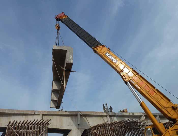 紅旗架橋機、遼原型架橋機屬于此類,起重量也為噸。動臂由左右兩根箱形梁組成,兩根梁貫穿機身并前后延伸。兩端有折疊立柱,每個立柱由兩條腿桿組成。紅旗型的兩道光束中間距離為3、4米,遼原型車的距離為4、8米。兩臺箱梁上有兩臺小車,可沿吊桿縱向行駛。吊梁小車置于桁架上,可沿桁架橫向行駛。待架設的梁(或整梁)可由鐵路平板車直接送至架橋機后臂下方。由吊梁小車提升后,由桁架車前移,再由吊梁車橫向移動,然后落梁。少量。該型架橋機前后端可吊放梁;改變光束方向時,無需轉身;為適應曲梁,前后臂可在水平面內擺動;立件時無需移動橫梁或刻度盤。道、梁可就位; “送梁”不需要橋梁跨線或專用運梁車。