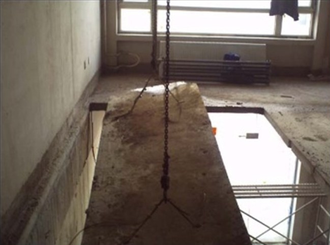 切割完后采用2個手拉葫蘆將切割好的樓板吊裝輕放至下層樓面或地面。